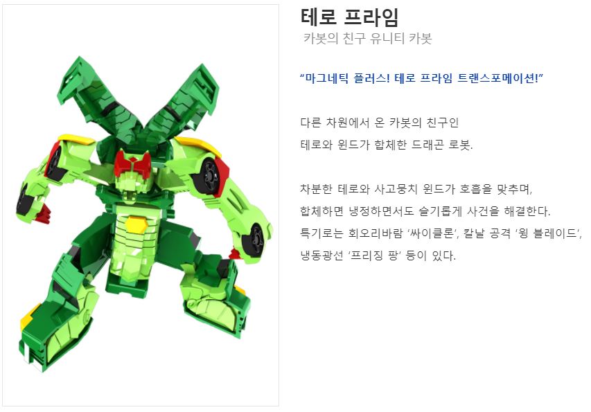 다른 차원에서 온 카봇의 친구인 테로와 윈드가 합체한 드래곤 로봇.