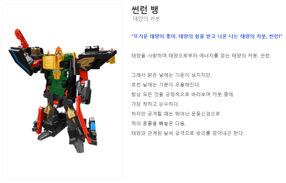 “뜨거운 태양이 좋아. 태양의 힘을 받고 나온 나는 태양의 카봇, 썬런!”
