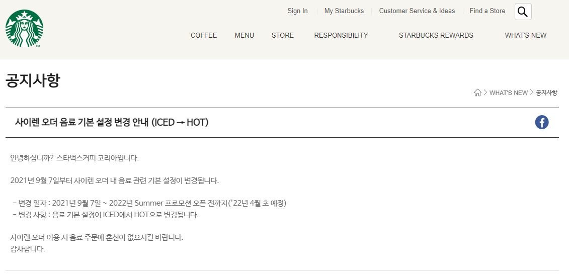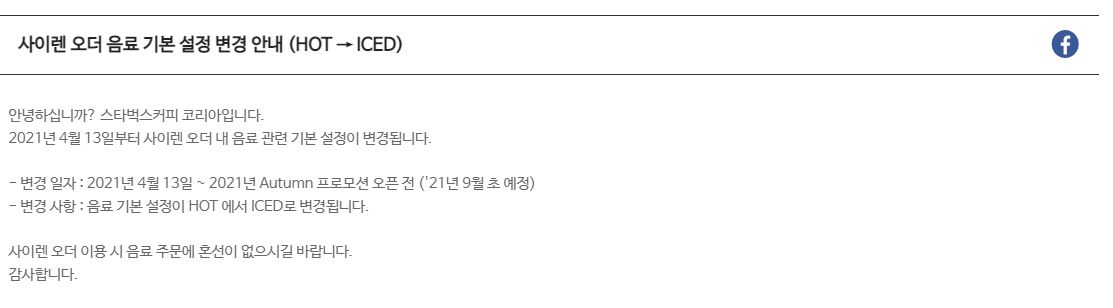 매년 사이렌 오더 주문 시 음료 기본설정(아이스인지 핫인지)에 대한 공지를 한다 (시기는 매년 비슷한듯 안한듯)